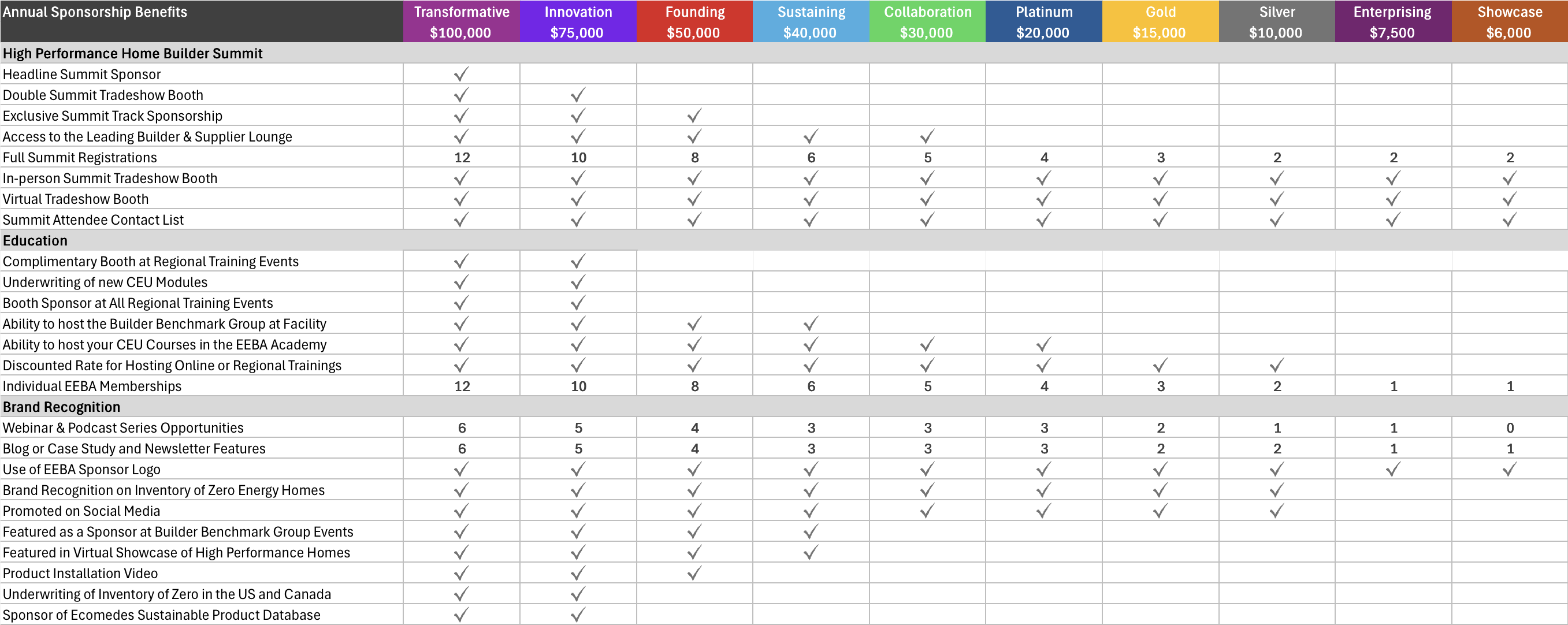 • Attendance to the EEBA High Performance Home Builder Summit with full Summit access for company individuals. Additional Summit tickets will be at the discounted EEBA member rate.